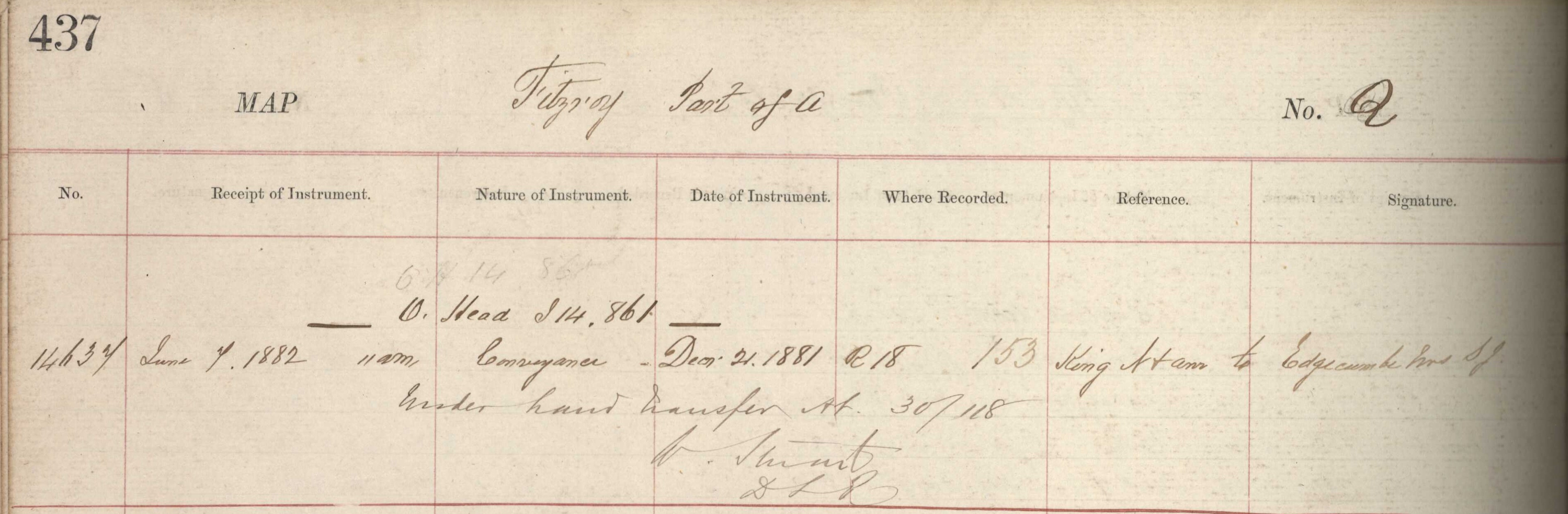Town Belt (Part) A Section Q, Taranaki Land Deed Index I14 page 437. (Archives New Zealand)