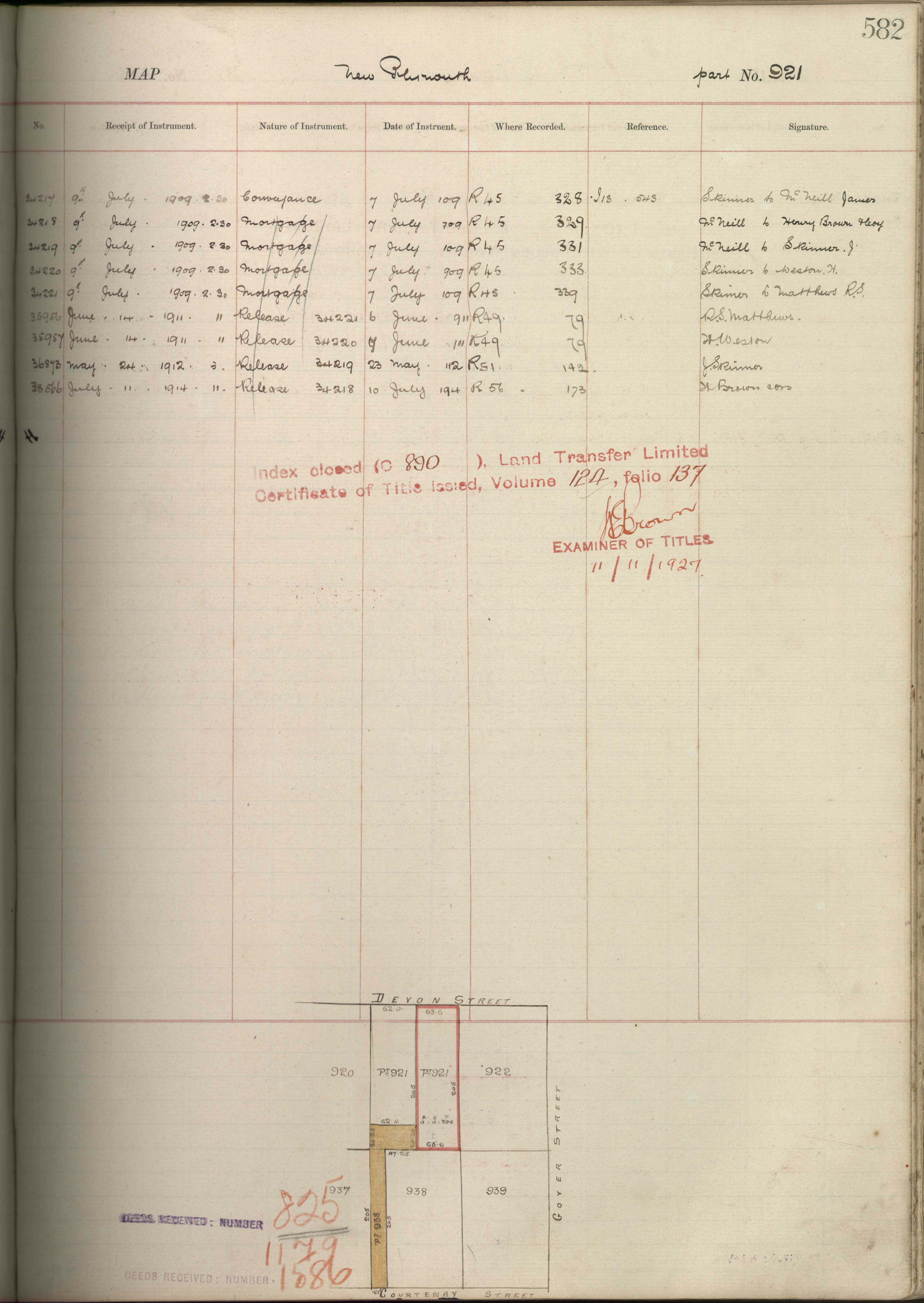 Town Section (Part) 921, Taranaki Land Deed Index I13 Page 582. (Archives New Zealand)