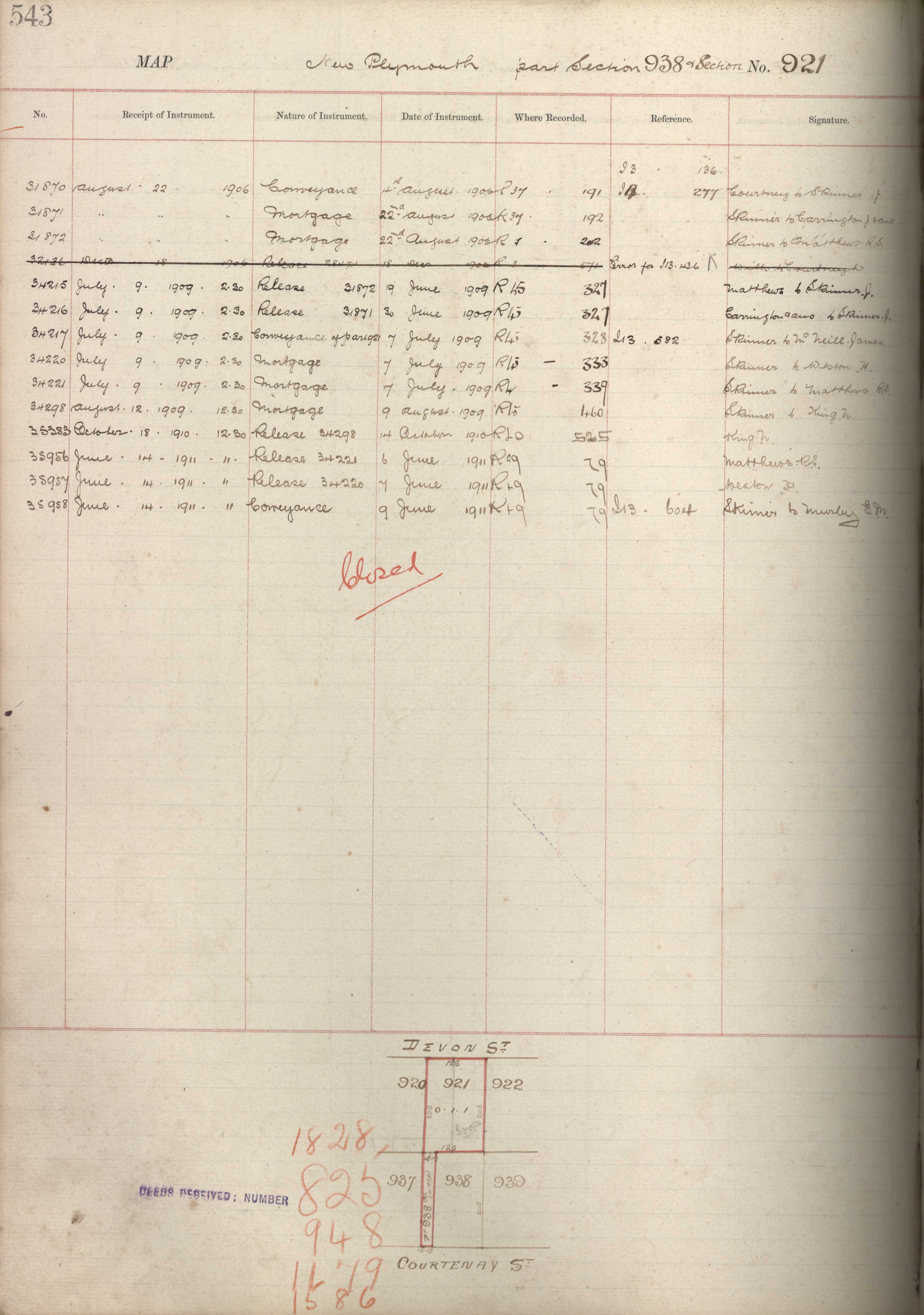Town Section (Part) 921, Taranaki Land Deed Index I13 Page 543. (Archives New Zealand)