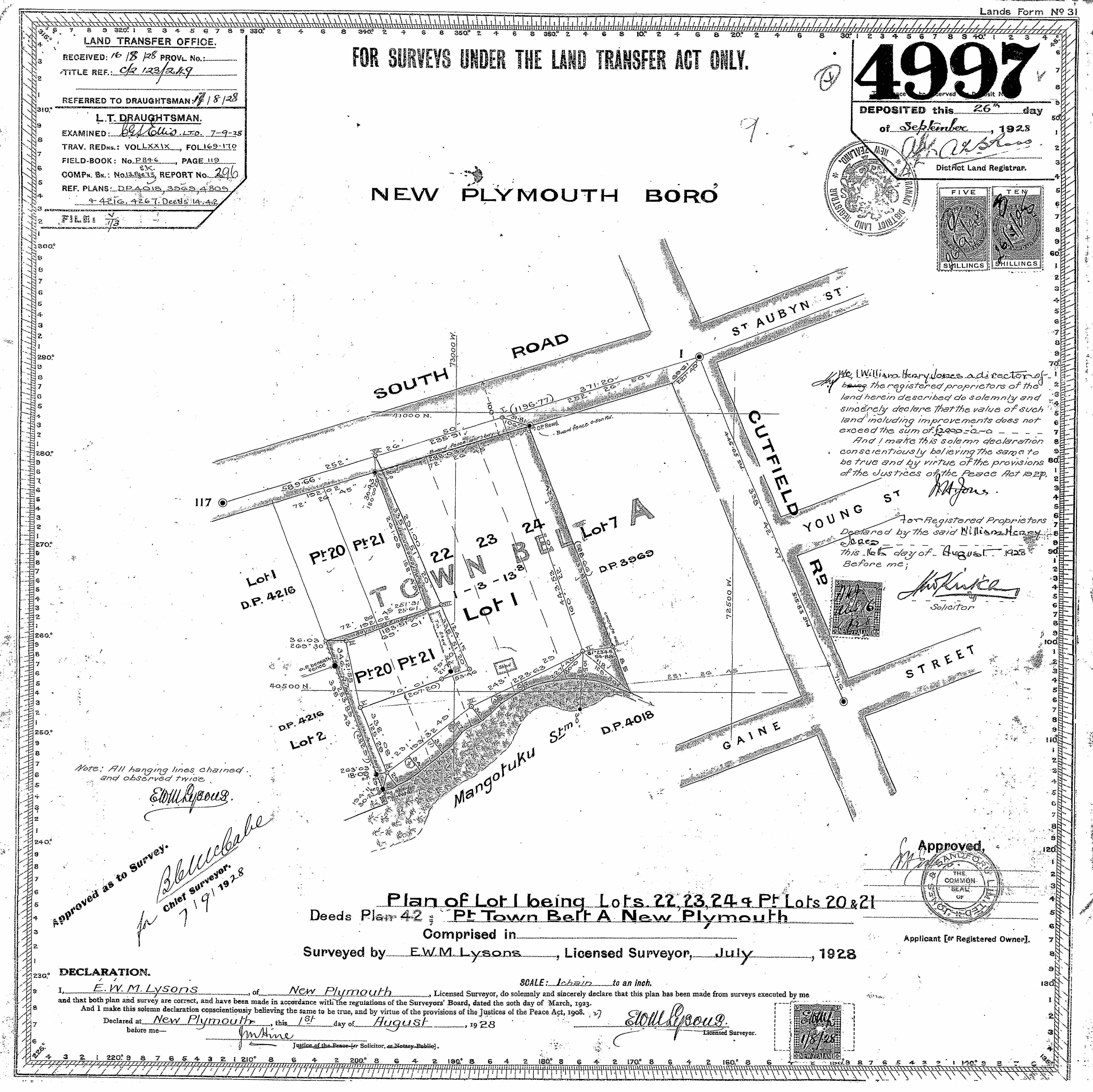 Taranaki DP4997 Sheet 1 (1928), ICS Pre 300,000 Cadastral Plan Index (Imaged by LINZ)