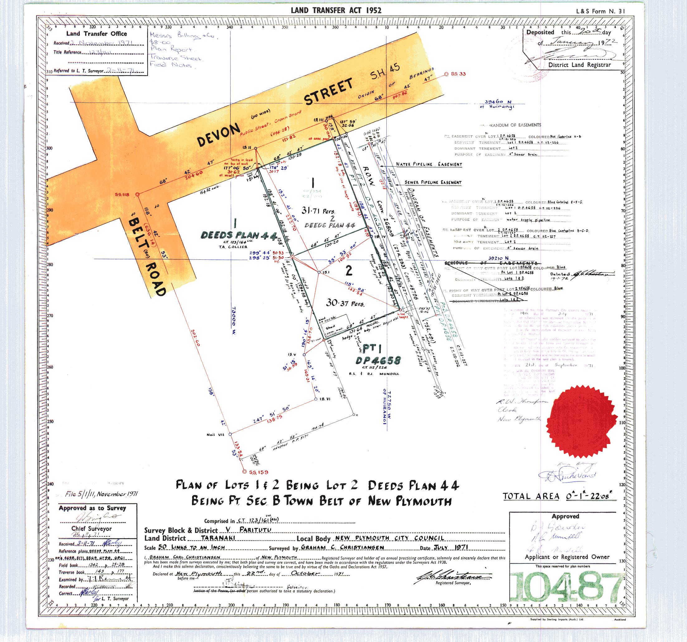 Taranaki (Lot 2) DP10487 Sheet 1 (1971), ICS Pre 300,000 Cadastral Plan Index (Imaged by LINZ)