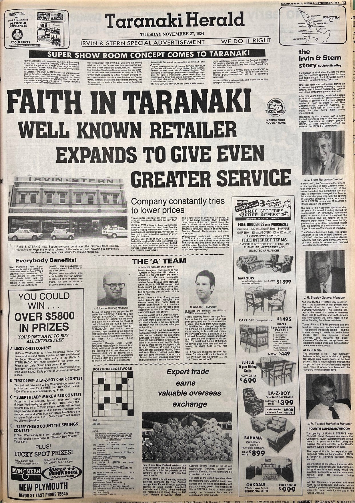 Faith in Taranaki: Irvin & Stern Advertisement (Taranaki Herald 27 November 1984)
