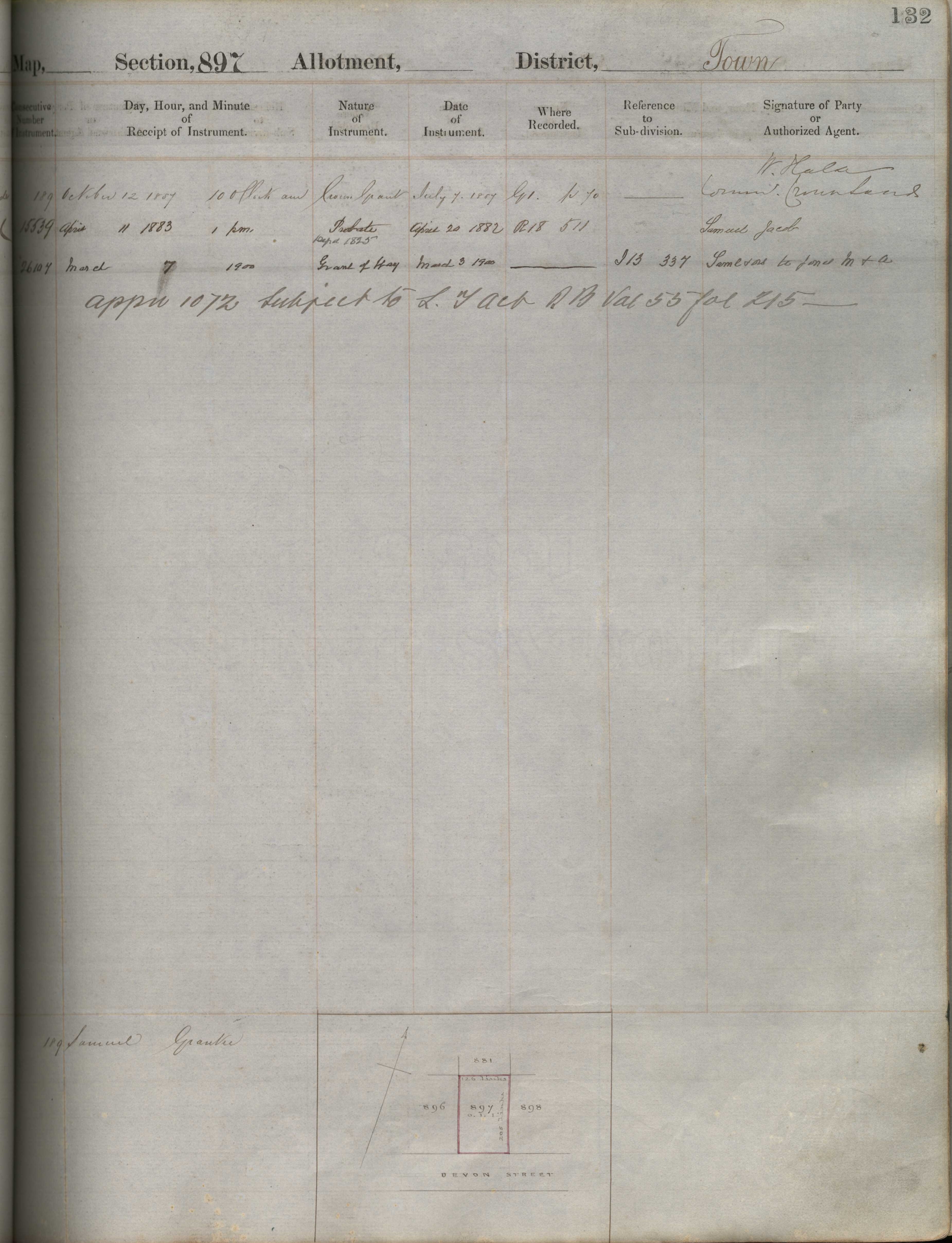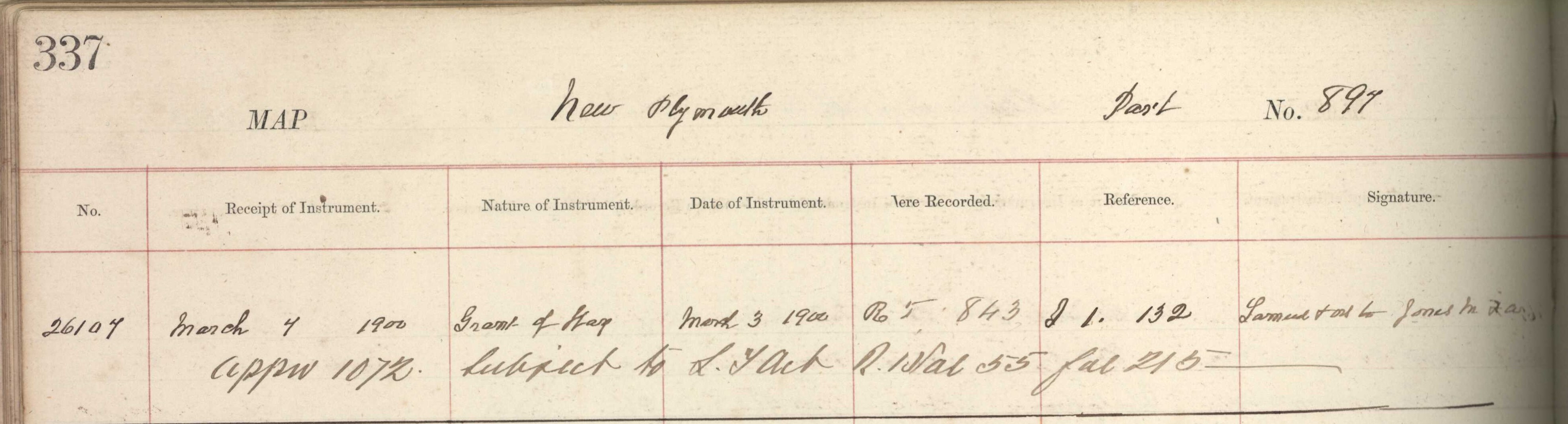 Town Section 897, Taranaki Land Deed Index I1 page 132 and I13 page 337. (Archives New Zealand)