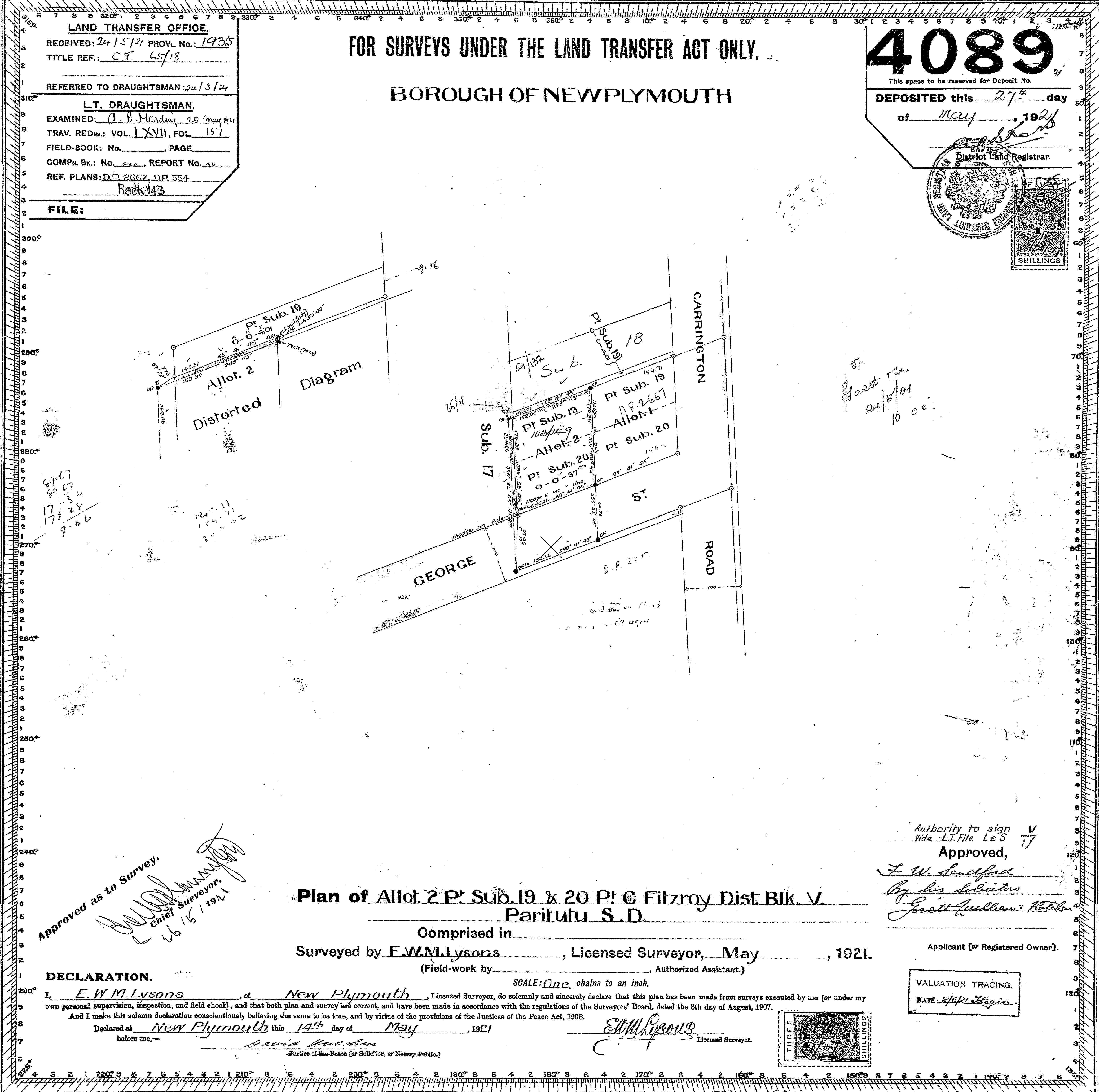 Taranaki (Lot 2) DP4089 Sheet 1 (1921), ICS Pre 300,000 Cadastral Plan Index (Imaged by LINZ)
