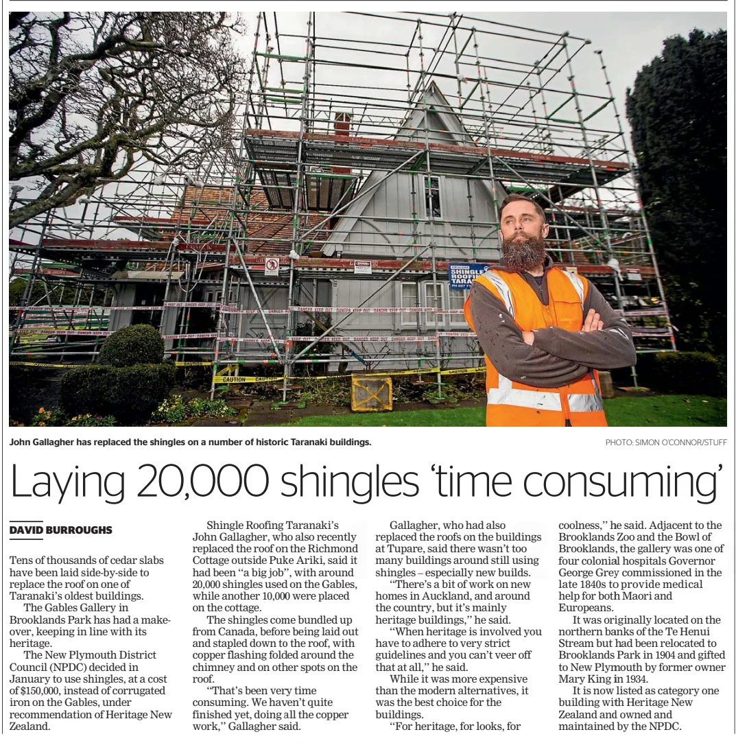 Laying 20,000 Shingles 'time consuming' (Taranaki Daily News 22 July 2017)