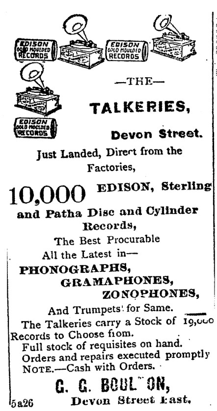It's clear from reports (TH 20 March 1907) and advertisements in the newspaper that by the early 1900s George had branched out into "phonographs, gramophones and zonophones" as well carrying a sock of some "19,000 records".