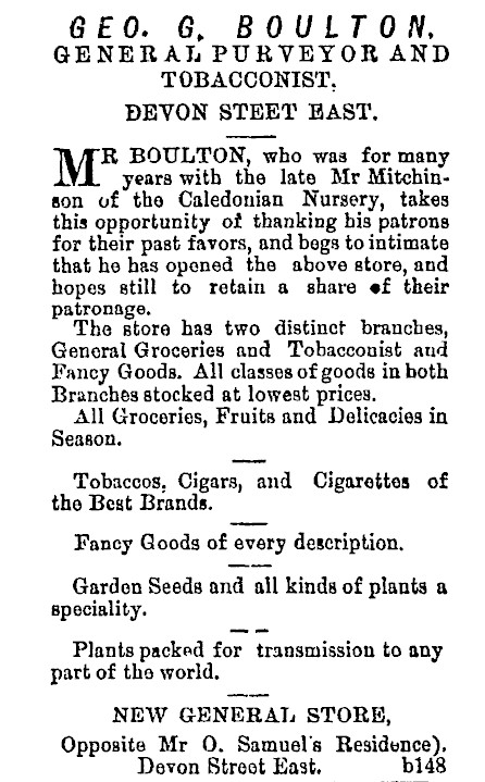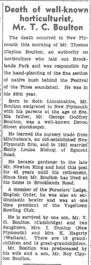 In 1875 he immigrated to New Plymouth on the ship Halcione with his wife Anne and two children – Thomas Clayton (5) and Charles Frederick (3). On the passenger manifests for this trip George was listed as a farm labourer from Lincolnshire, England. Upon arriving in New Plymouth, he entered employment as a manager at Mitchinson’s nursery on Lemon Street. He was in this position until he opened his store in 1896. He also worked with his son Thomas at Mitchinson’s nursery. Thomas Boulton is also known for his involvement at Brooklands Park – he worked for Newton King as a Head Gardener and was heavily involved in initial plantings at Brooklands Park.