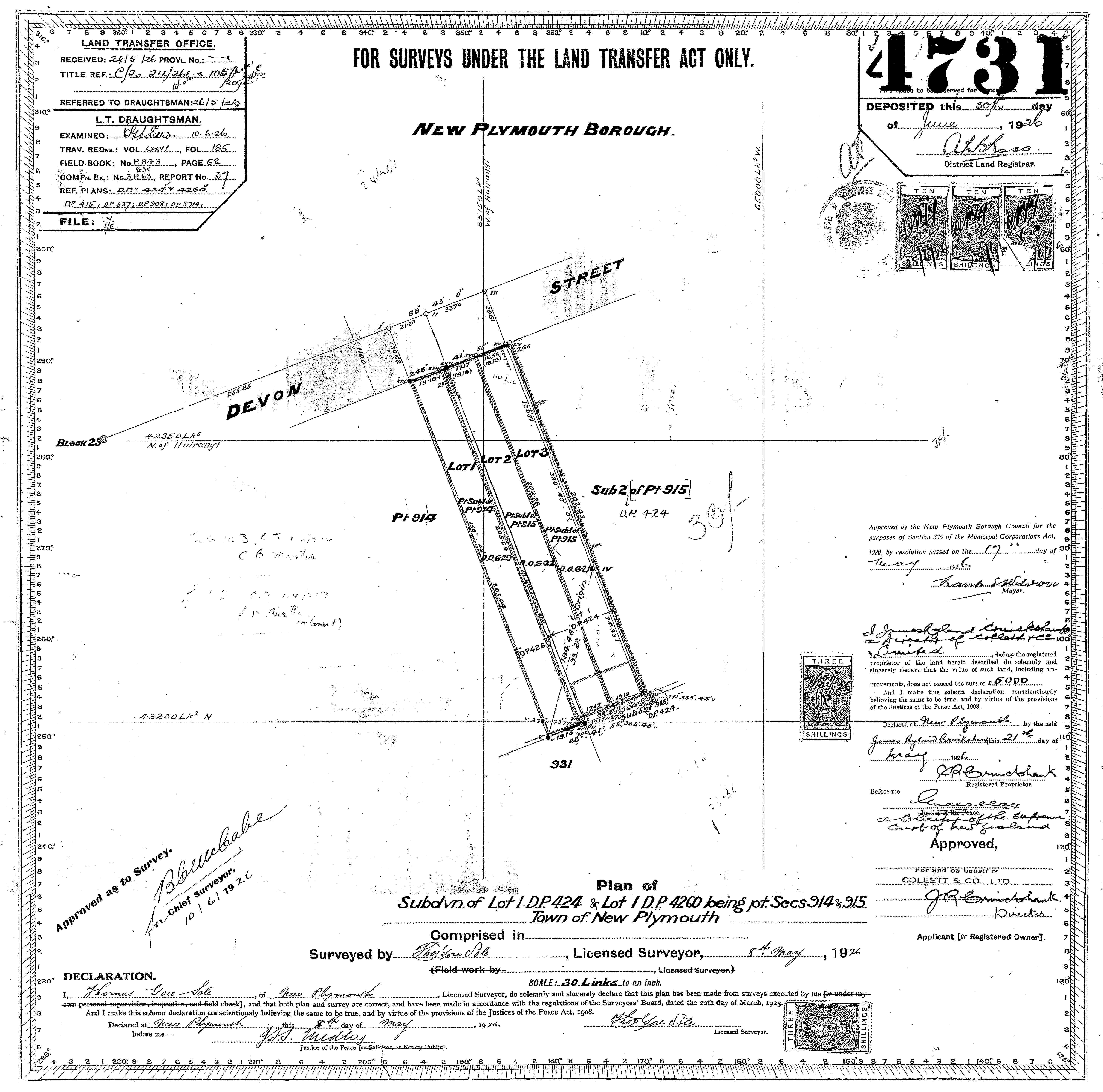 Taranaki DP4731 Sheet 1 (1926), CS Pre 300,000 Cadastral Plan Index (Imaged by LINZ)