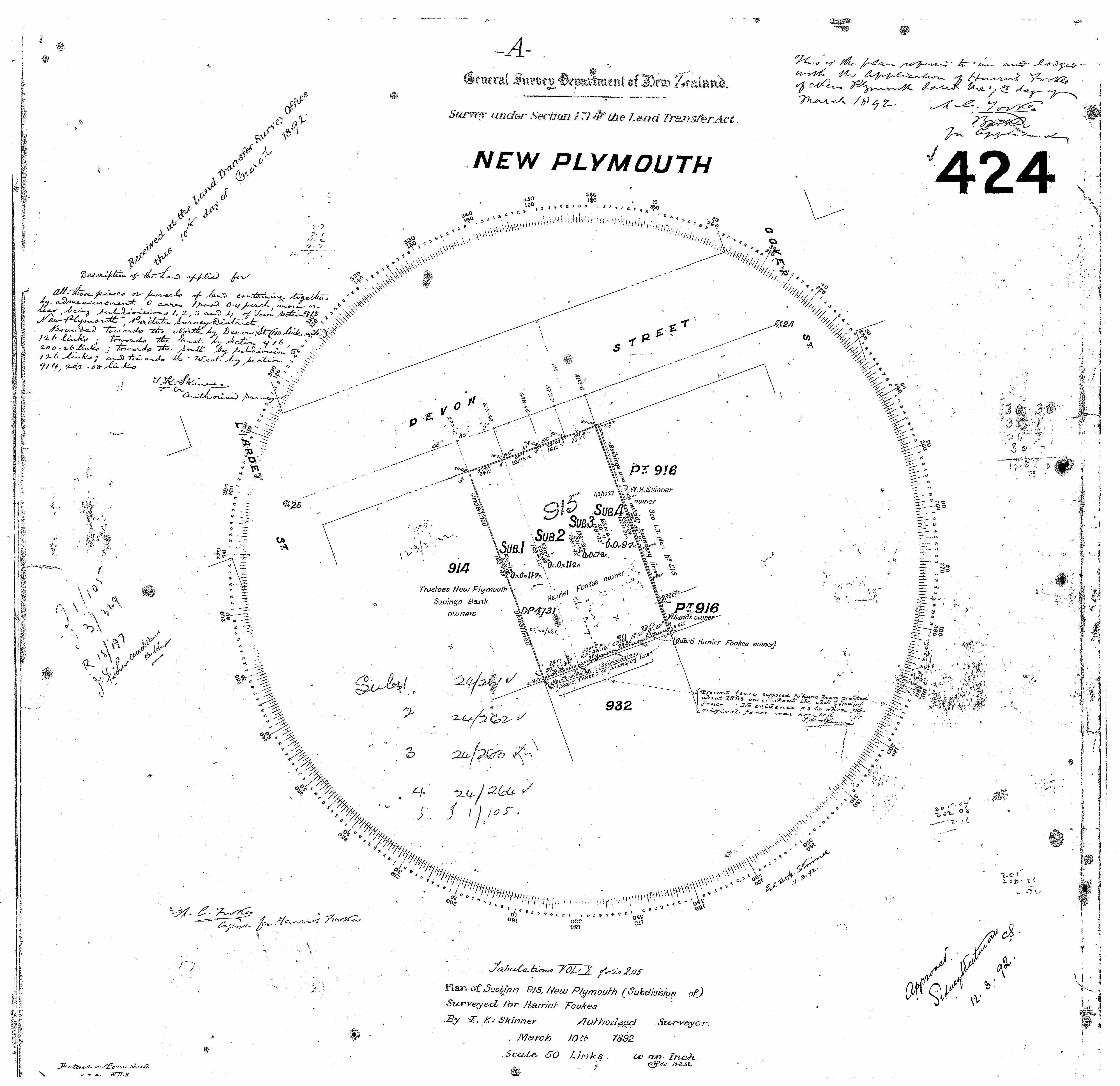 Taranaki DP424 Sheet 1 (1892), ICS Pre 300,000 Cadastral Plan Index (Imaged by LINZ)