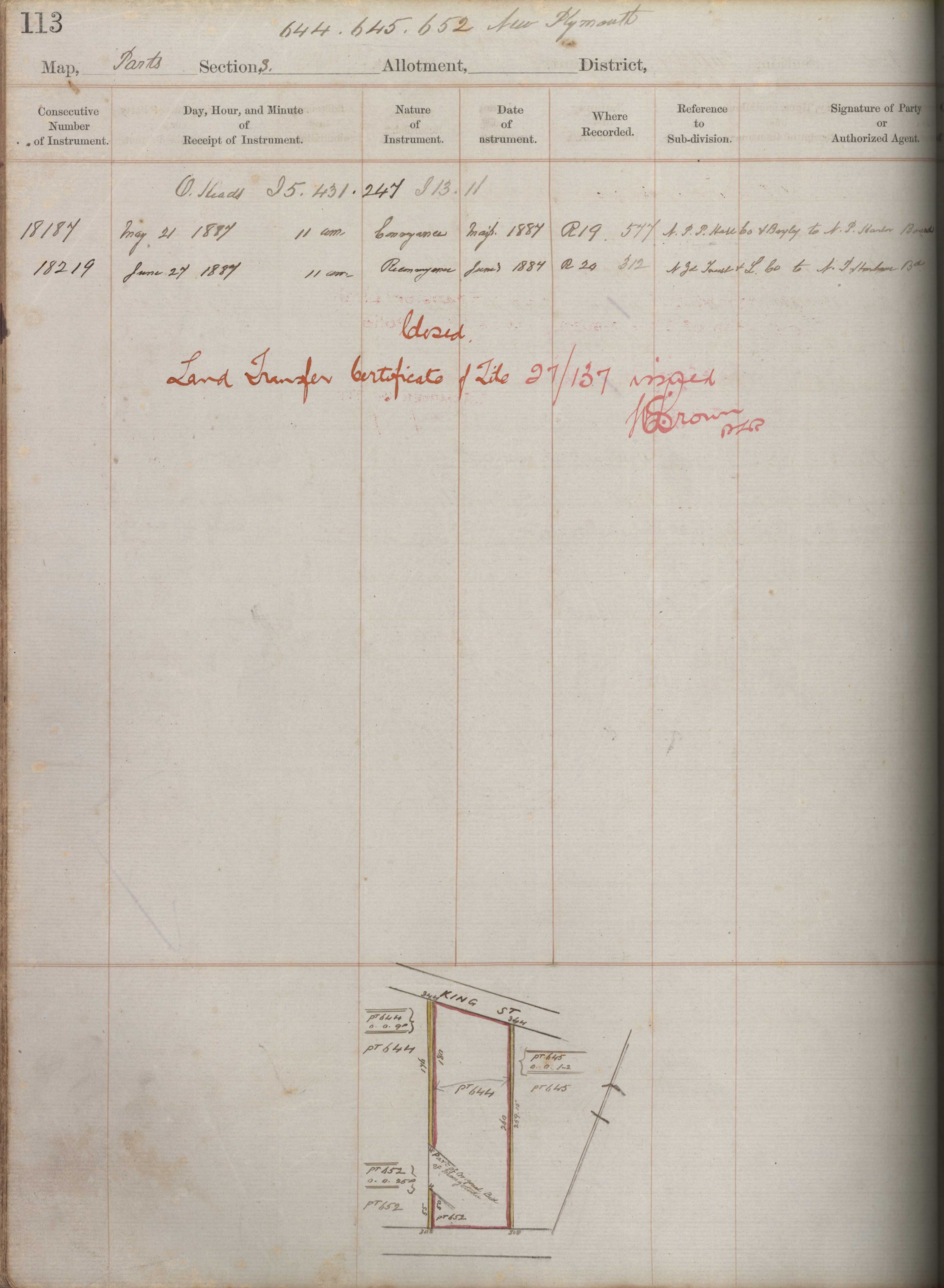 Town Section (Part) 644, Taranaki Land Deed Index I4 page 113. (Archives New Zealand)