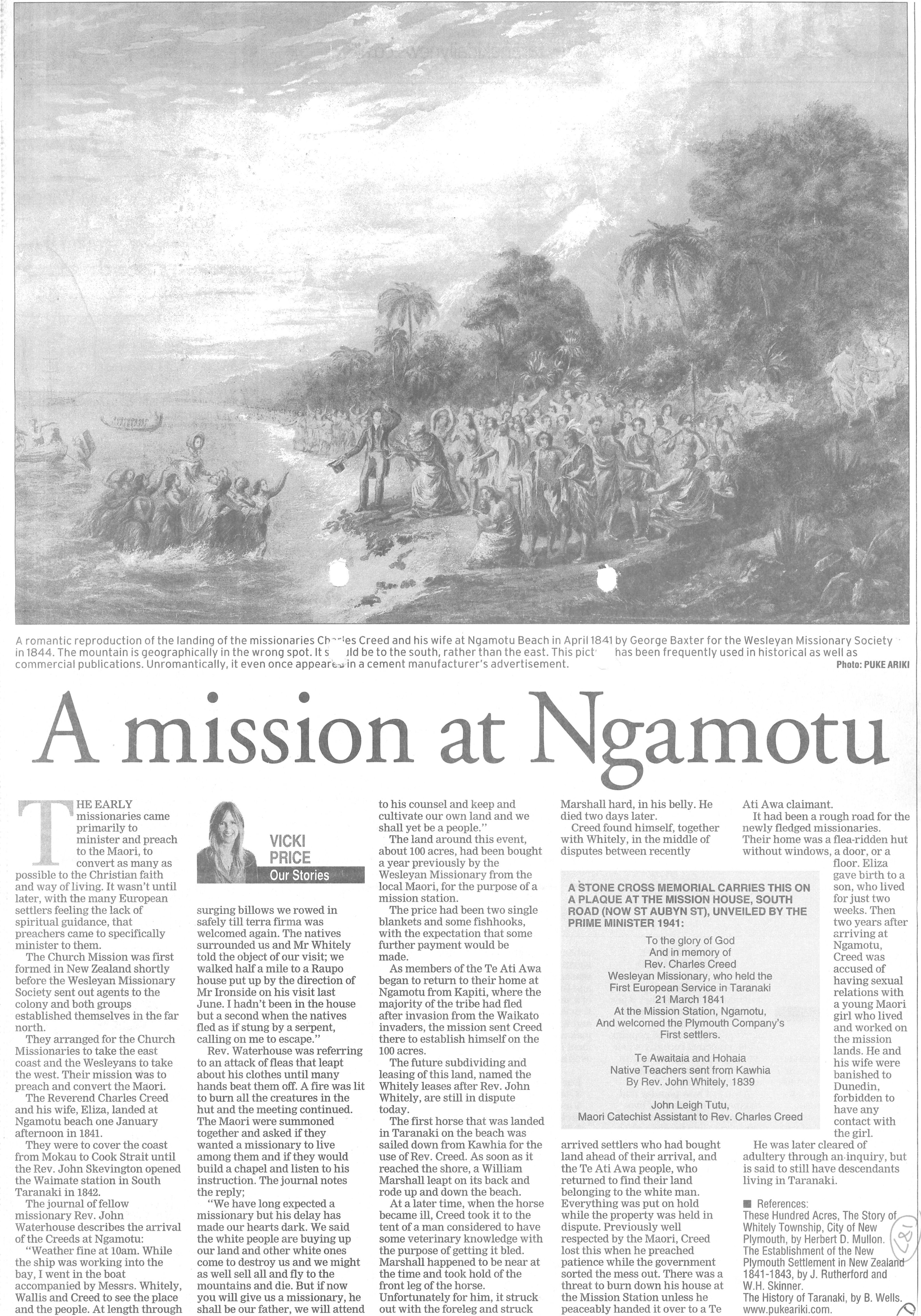 A Mission at Ngamotu, Vicki Price (Taranaki Daily News 1 January 2008)