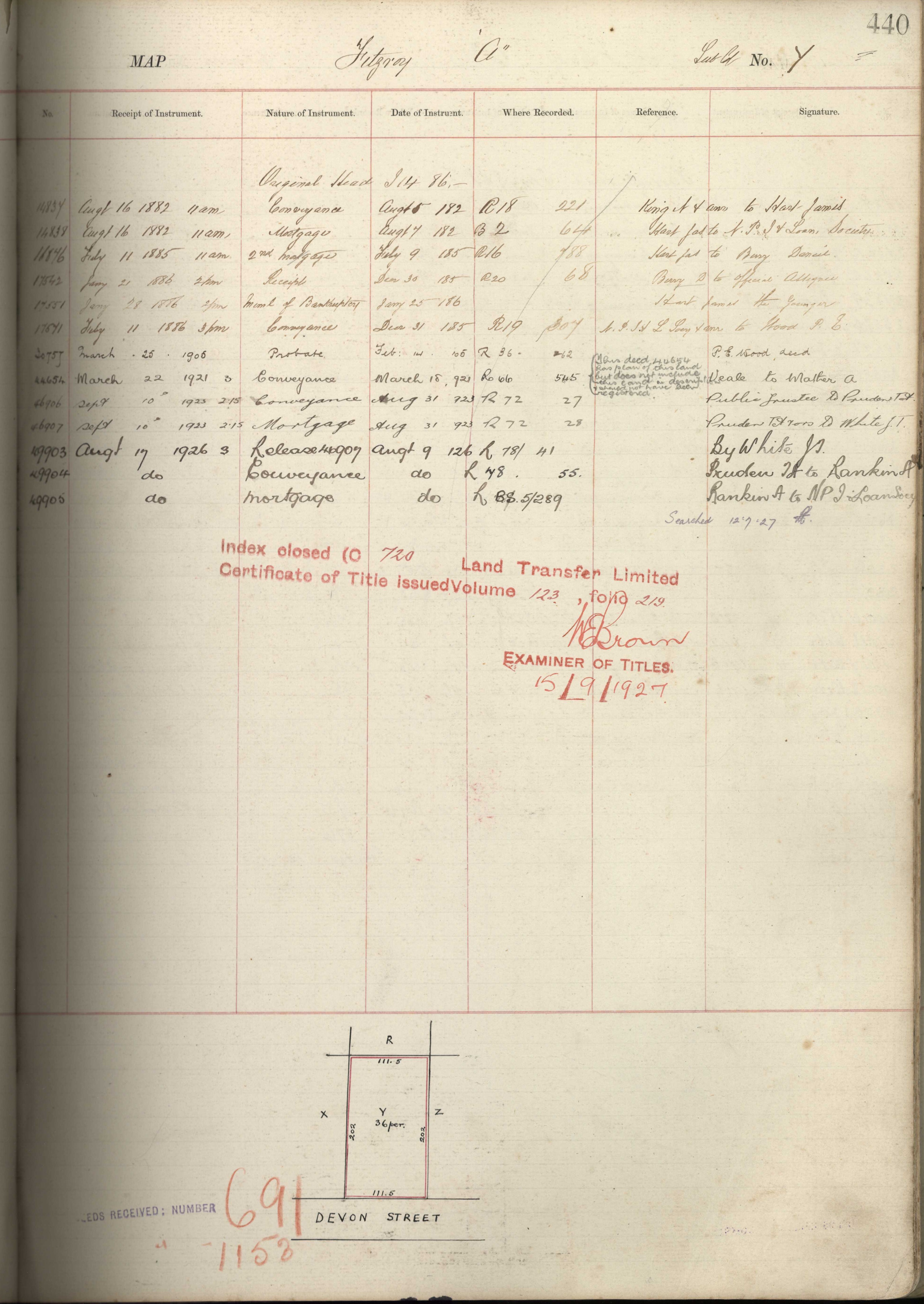 Section Y Town Belt A, Taranaki Land Deed Index I14 page 440. (Archives New Zealand)