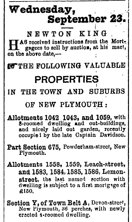 Given hotel proprietors generally lived on the premises, upon leaving the Windsor Castle Hotel, Hart is likely to have needed to find accommodation, and it seems he had the present house constructed in early-mid 1885, with a second mortgage taken out against the property in February 1885 likely relating to the construction of the present dwelling. Further supporting a construction date of early-mid 1885, is an advertisement placed in the Taranaki Herald in September 1885, advertising Section Y of Town Belt A for sale with "newly erected 4-roomed dwelling".