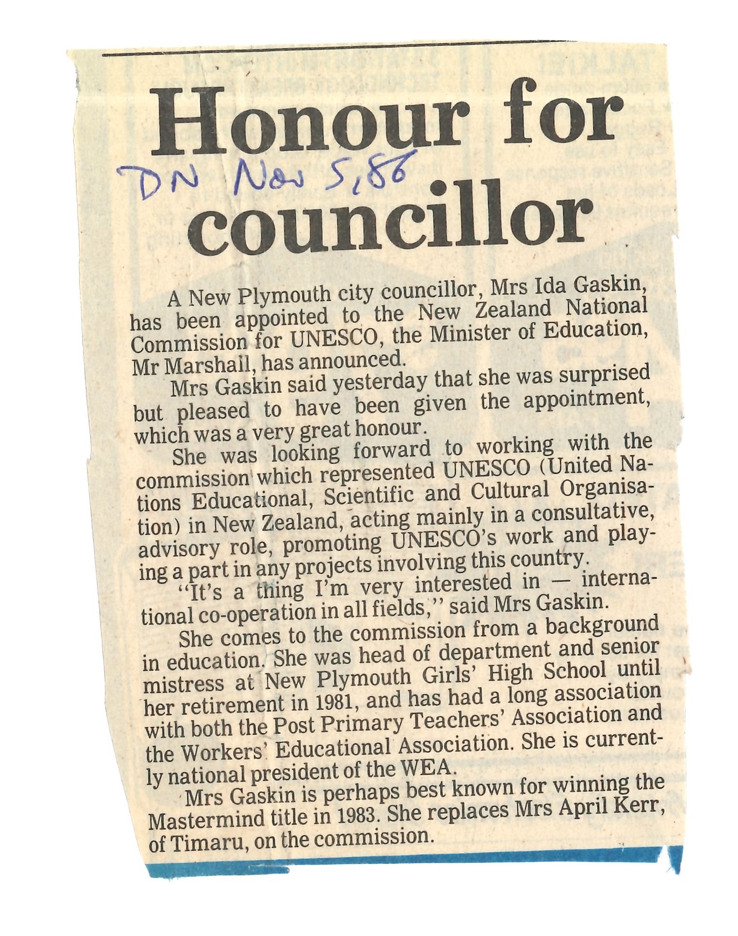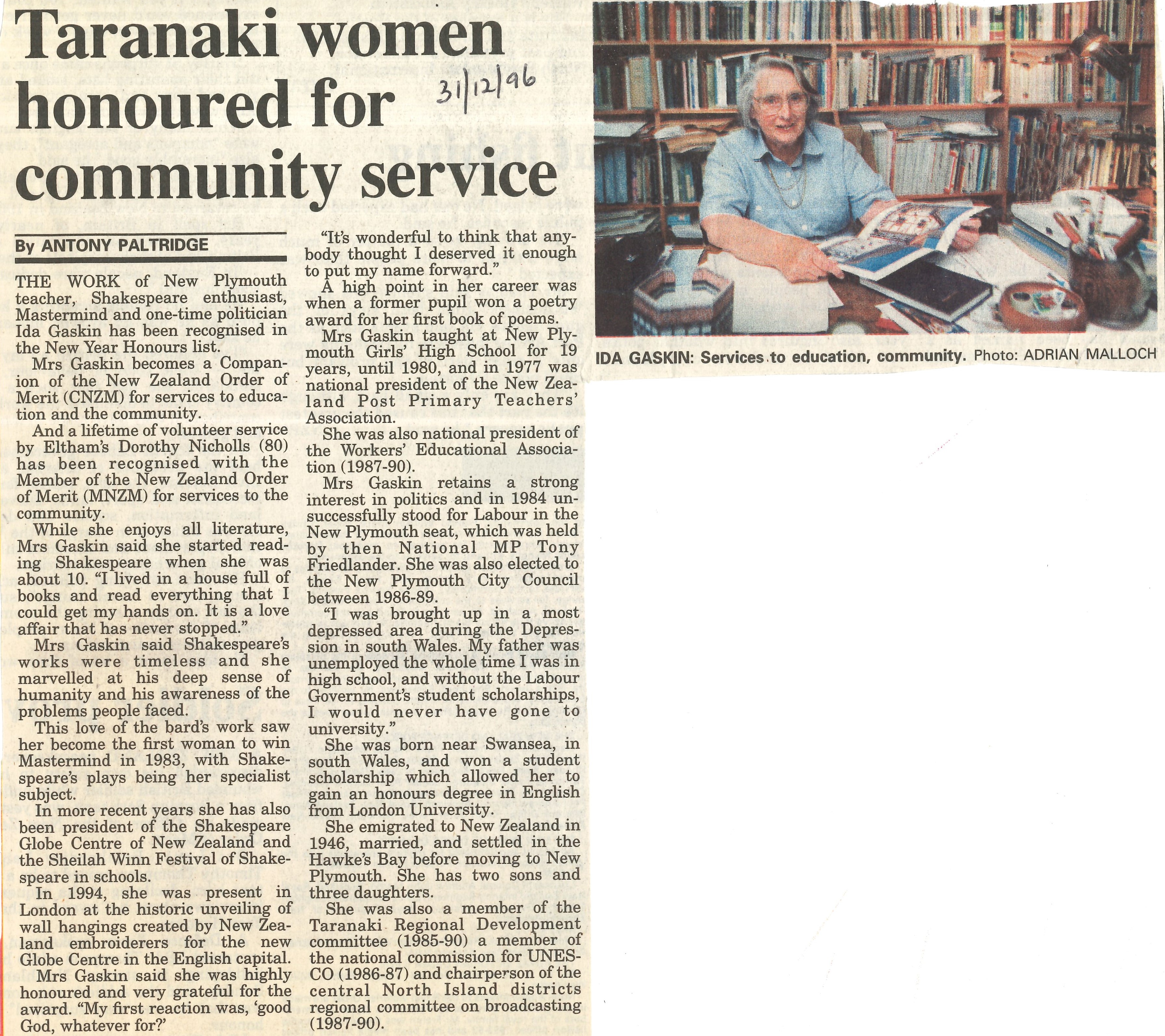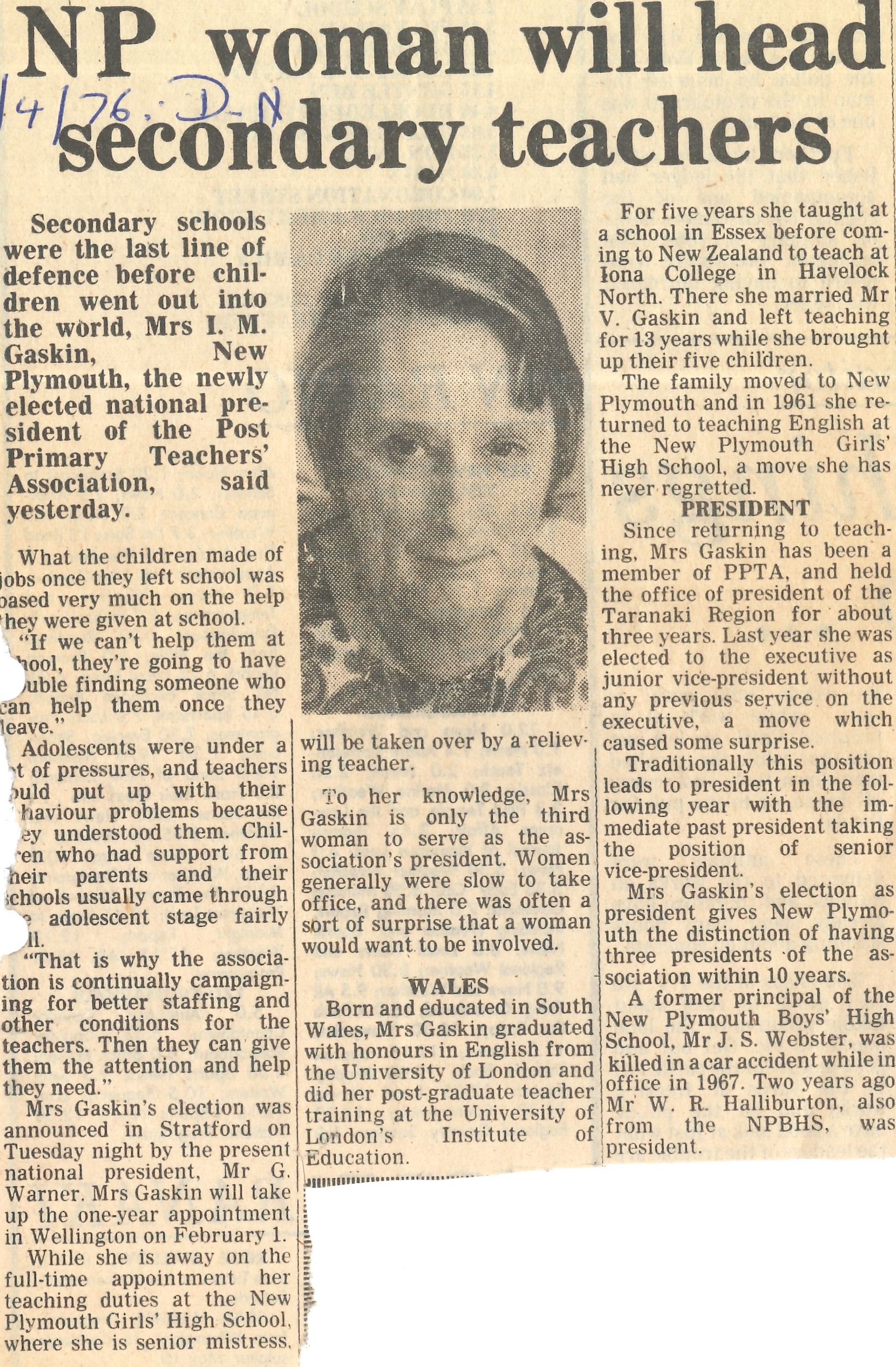 After teaching in London throughout World War Two, Ida made the bold decision to emigrate to New Zealand, arriving on the RMS Rangitata in 1946. She met and married Victor Gaskin, and the couple settled in New Plymouth in 1961, raising five children. They later divorced.