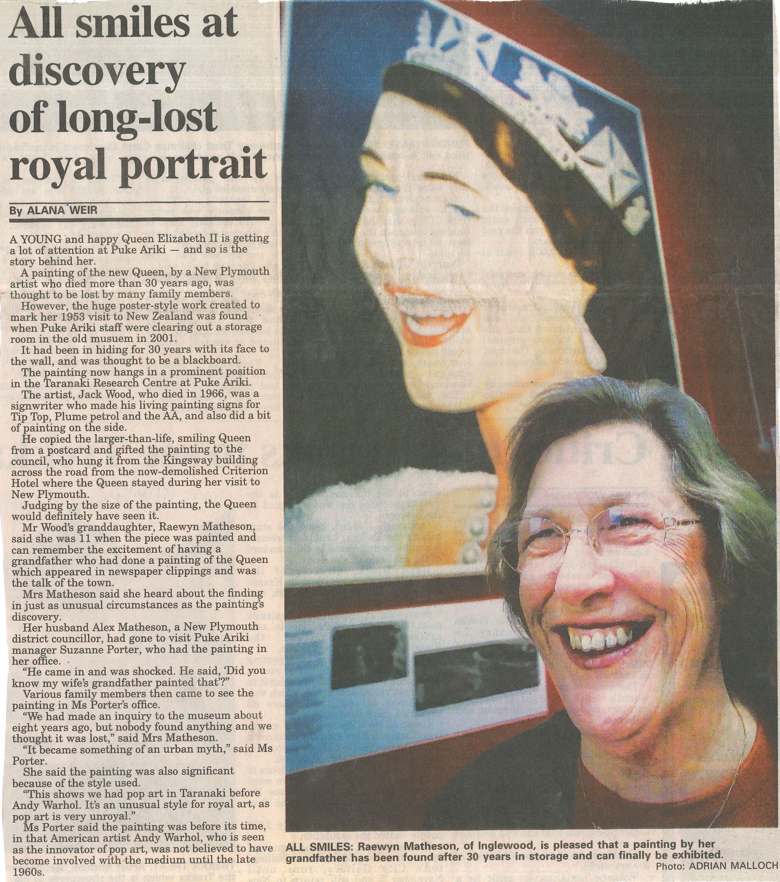 If you visited Puke Ariki’s Taranaki Research Centre you may remember the portrait of a jovial young Queen Elizabeth II, which was removed in 2025. It was painted by local sign writer Jack Wood and was based on a glitter encrusted postcard he had in his possession. The postcard’s lively portrait was said to be Winston Churchill’s favourite depiction of the newly crowned Queen. The huge portrait was mounted on the exterior of the King’s Building during the Queen’s visit to New Plymouth in January 1954. Despite its size, the painting was lost for more than 30 years before it was discovered in the old library and museum building in 2001 while it was being cleared for the construction of Puke Ariki. Jack Wood’s sign writing business, Wood Sign Service, was responsible for the meticulously painted signage of a range of small businesses around the Taranaki district.