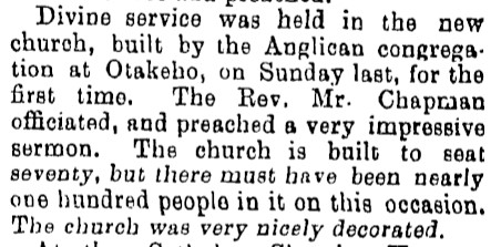 St John the Divine in Otakeho was first used on Easter Sunday 1893 and was consecrated the following year on 14 March 1894.