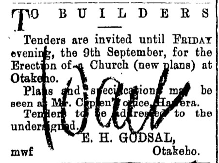 At the time the church was built it appears the section (Otakeho Town Section 51) was owned by Edward Godsal who was also responsible for inserting the tender advertisements.
