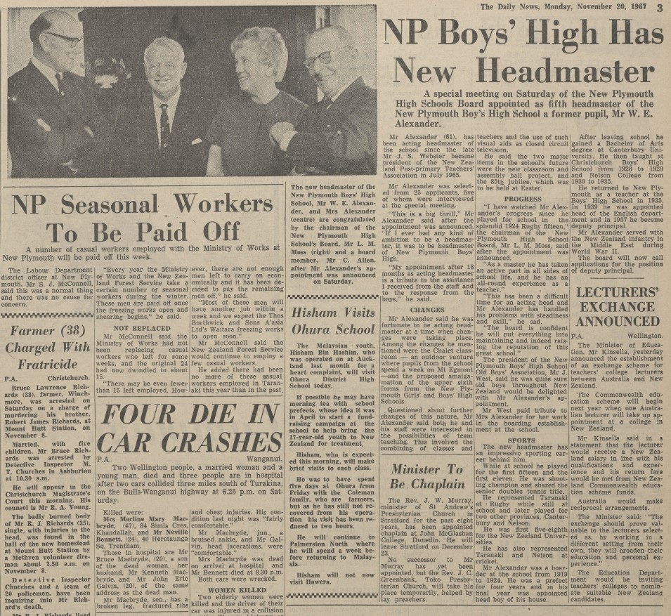 Resuming his teaching career at the New Plymouth Boys’ High School, he became deputy headmaster in 1957. In 1967 he was appointed headmaster. He was the first pupil of the school to become the school’s headmaster.