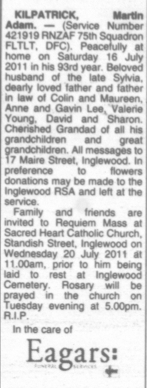 Martin Kilpatrick lived the rest of his life in Inglewood, dying at the age of 92 on 16 July 2011, and is buried in Inglewood Cemetery.