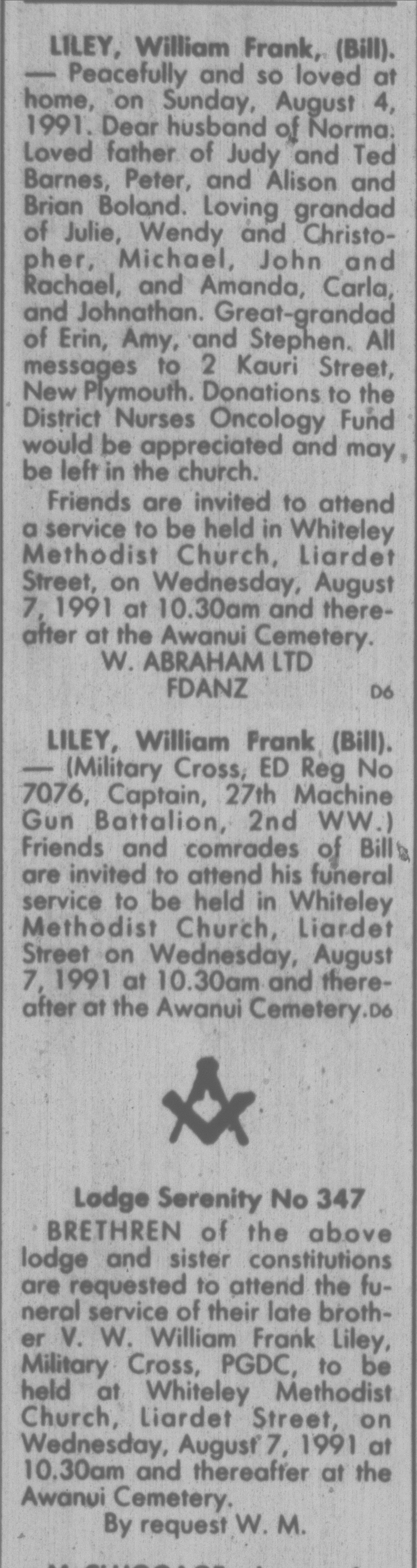 Bill Liley died of cancer at his home in New Plymouth on 4 August 1991 and is buried at Awanui Cemetery.