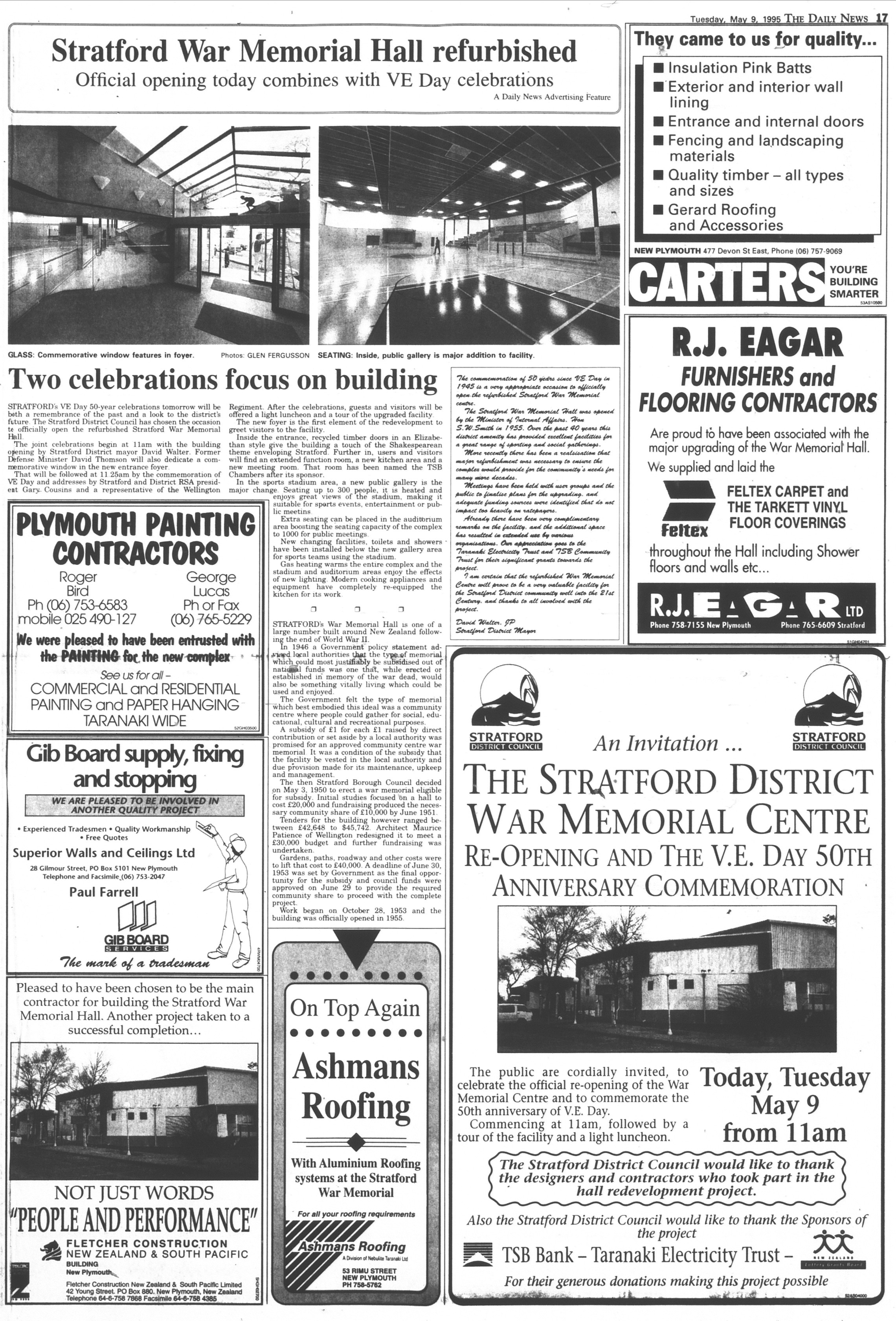 Stratford War Memorial Hall refurbished (Taranaki Daily News 9 May 1995)