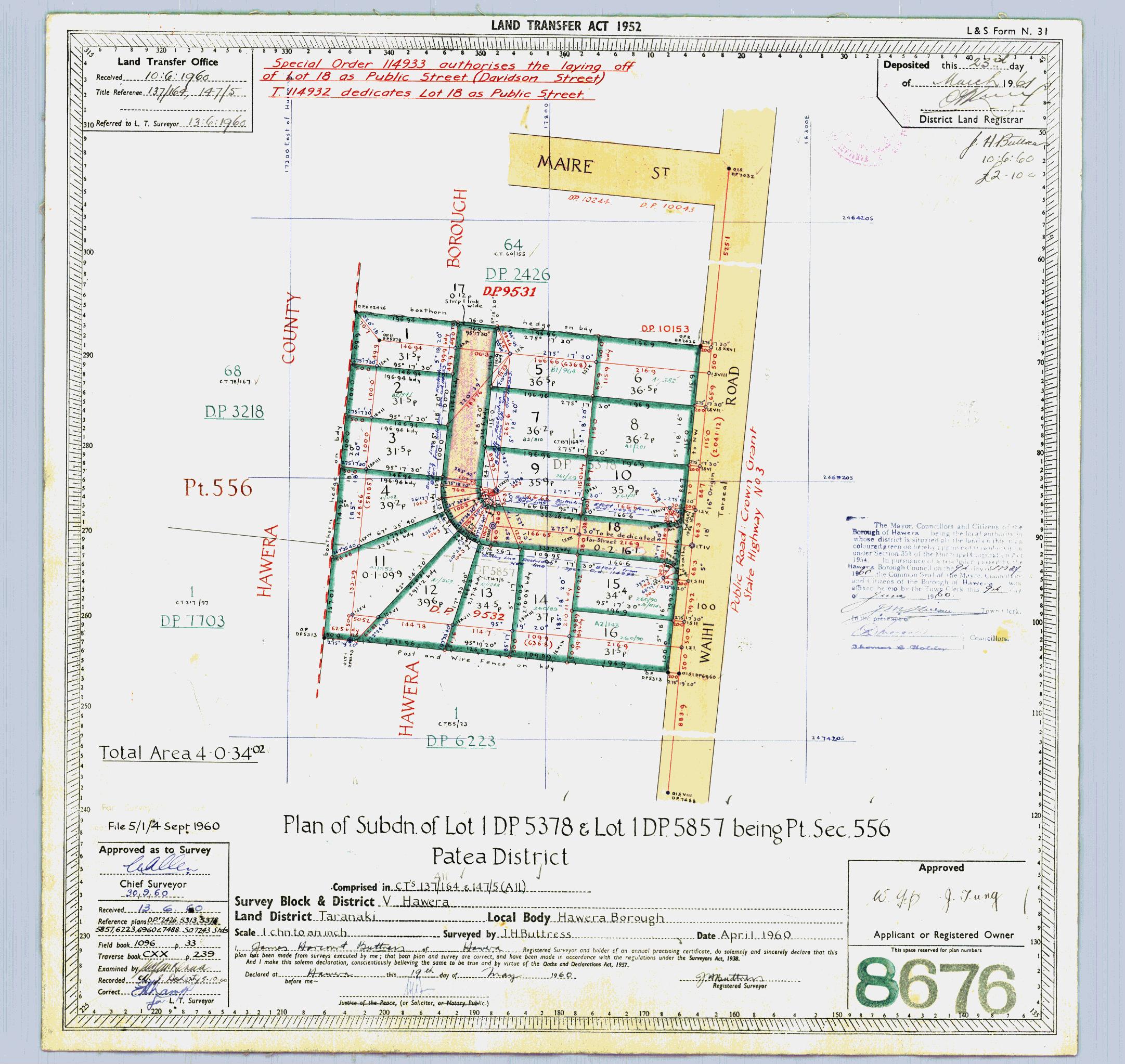 Taranaki DP8676 Sheet 1 (1960), ICS Pre 300,000 Cadastral Plan Index (Imaged by LINZ)