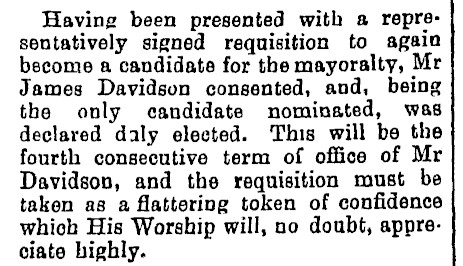 Davidson elected unopposed (Hawera & Normanby Star 19 November 1891 p.2)