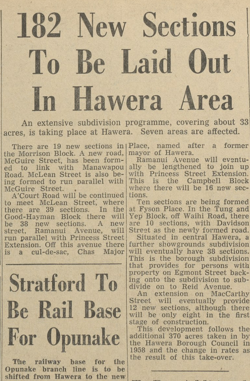 182 new sections to be laid out in Hawera area (Daily News 9 May 1961 p.5)