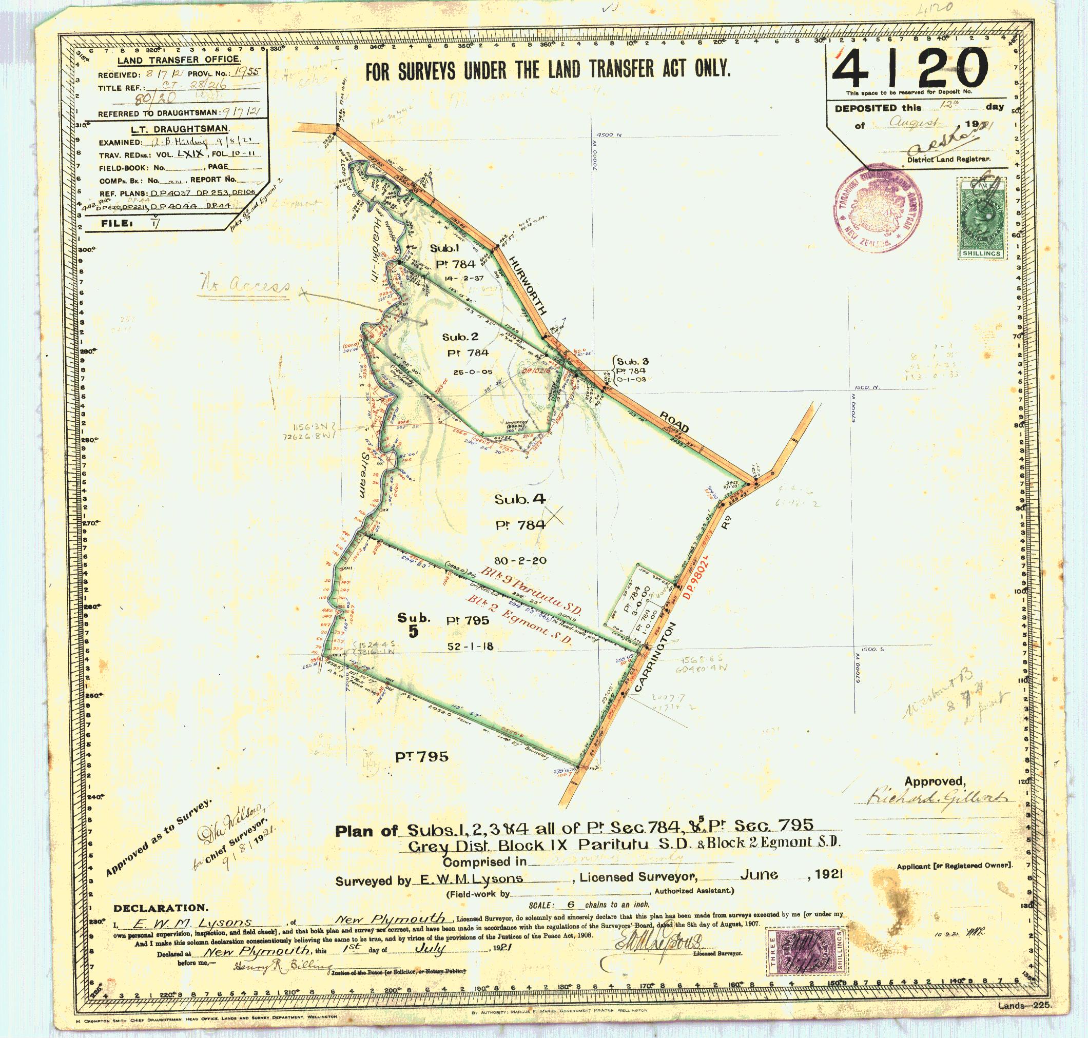 Taranaki DP4120 Sheet 1 (1921), ICS Pre 300,000 Cadastral Plan Index (Imaged by LINZ)
