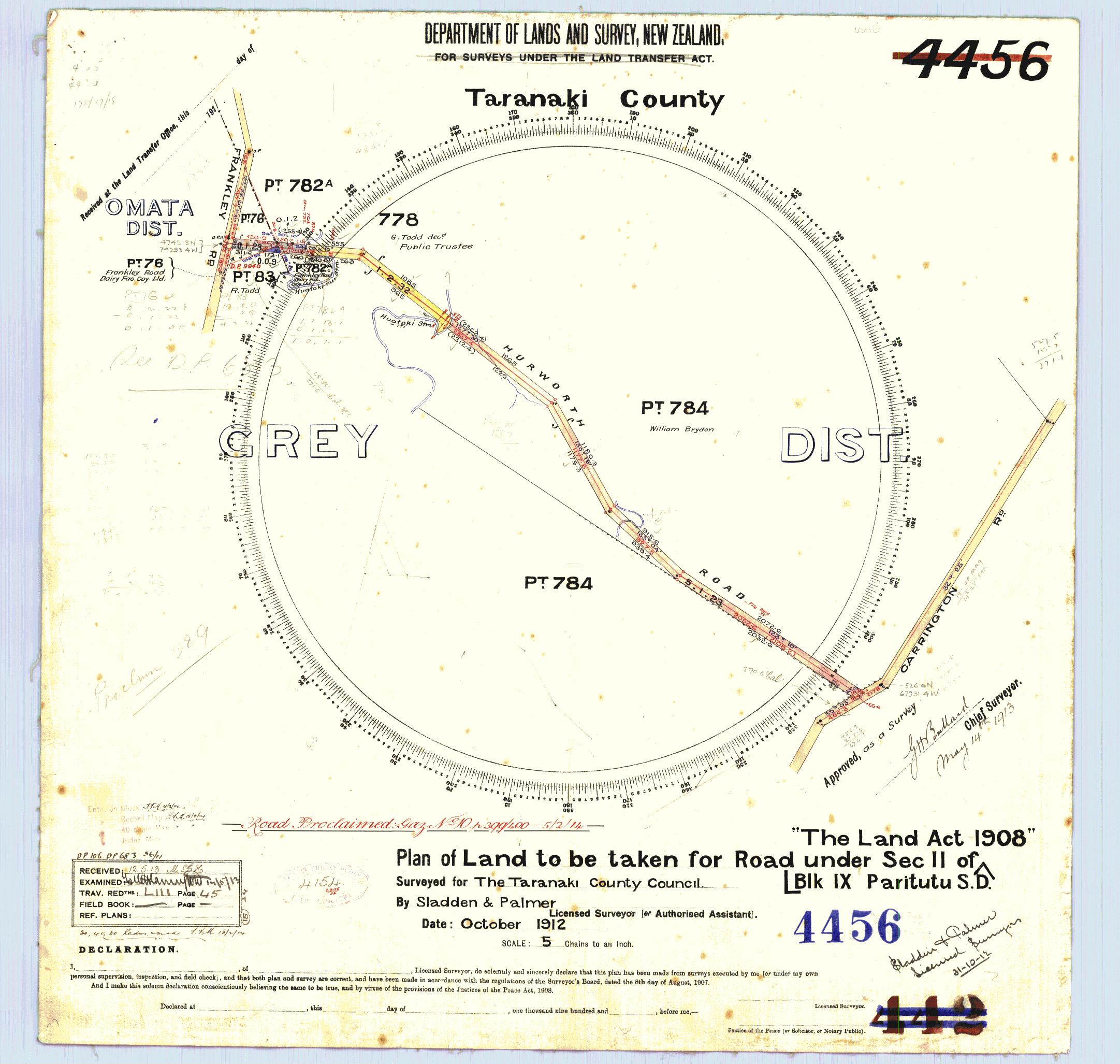 Taranaki SO4456 Sheet 1 (1912), ICS Pre 300,000 Cadastral Plan Index (Imaged by LINZ)