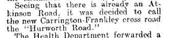 Hurworth Road was surveyed in 1912 and the plan approved by surveyor George Henry Bullard in May the following year. In August 1914, following the monthly meeting of the Taranaki County Council, it was announced that “seeing that there is already an Atkinson Road, it was decided to name the new Carrington cross-road the ‘Hurworth Road’”.