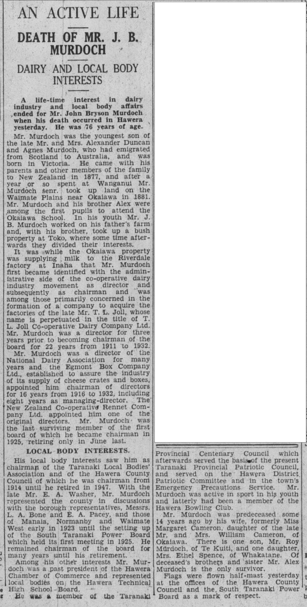 His assured leadership was in demand and Murdoch served as chairman of the South Taranaki Electric Power Board, the Taranaki Local Body’s Association and the New Zealand Rennet Company. The experienced farmer and businessman was also on the board of the T.J. Joll and Riversdale Dairy Companies, the Egmont Box Company and the South Taranaki Shipping Company.