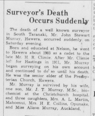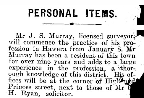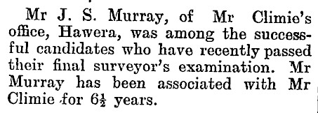 Alongside all the usual surveying tasks, newspaper reports suggest his role was more varied than might be the case today. Murray’s skills proved especially valuable in 1927 at a sports meeting held by the Hawera Amateur Athletic Club. The great Taranaki javelin thrower Stan Lay was competing and his throw of 205 feet 11 ½ inches (nearly 63 metres) set a new Australasian record. Official recognition was deemed to be mere formality as “the services of a surveyor (Mr J.S. Murray) were secured and accurate measurement made”.