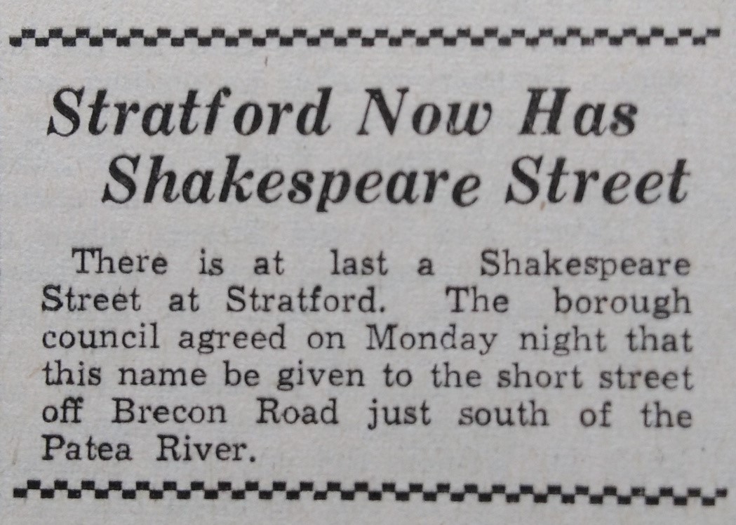 Shakespeare’s famous surname derives from the Middle English words ‘schakken’ meaning to brandish and ‘speer’ meaning spear. It had long been suggested that Stratford should have a street named specially for the man whose literary output had so inspired the town. Finally, on 19 May 1954 it became official. The Taranaki Daily News reported that the borough council had agreed to a new cul-de-sac off Brecon Road, just south of King Edward Park, being called Shakespeare Street.