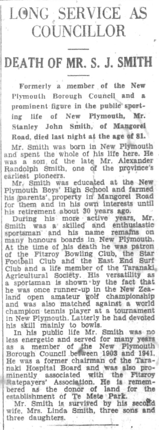 S.J. Smith died in 1951. Many years later the developer who subdivided and formed Te Mete Terrace named it in recognition of the playing fields below, donated by Smith and benefiting football and cricket to this day.